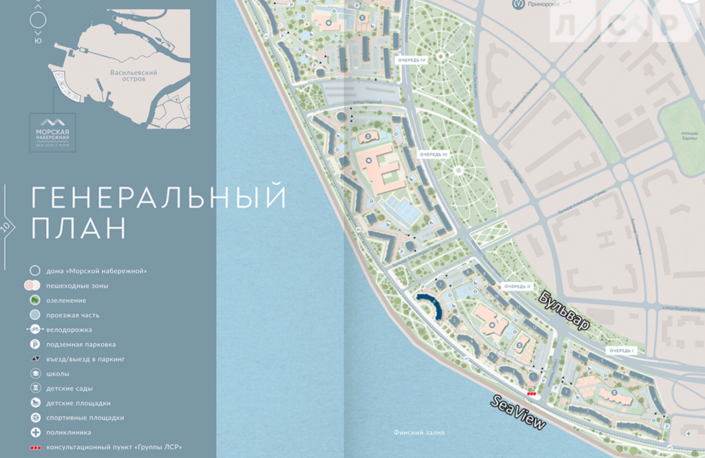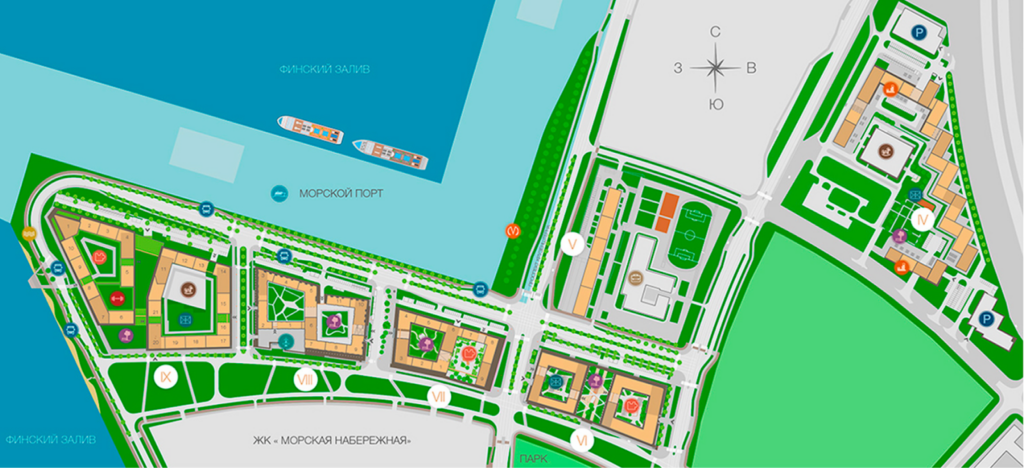 Планов освоения новых земель много. В сети можно найти много рендеров общего внешнего вида этой территории. Но они почти ничего не имеют с реальностью. Чтобы понять, что строят на намыве Васильевского острова, проще смотреть генпланы отдельных жилых кварталов. Так, например, будет выглядеть ЖК «Морская Набережная» от ЛСР: