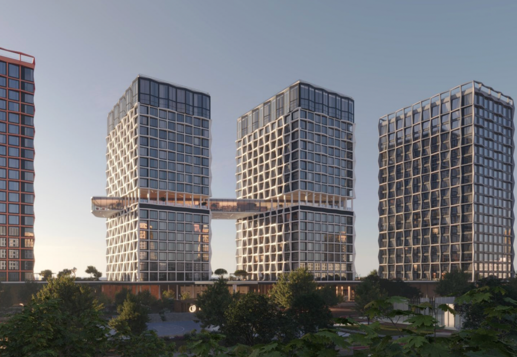 Проект представляет собой 5 башен высотой от 18 до 22 этажей. В проекте предусмотрены круглосуточная стойка ресепшн, собственный вестибюль с санузлом в каждой башне, колясочные. Башни TITAN и PLATINA на уровне 9 этажа объединяет «Небесный мост» — 1 000 кв.м. клубной инфраструктуры с панорамным видом на Финский залив. На территории проекта имеются собственная школа-лицей и детский сад. Планировки — от студий до пентхаусов. Сдаются они с отделкой White Box, высотой потолков от 2.85 до 7 метров