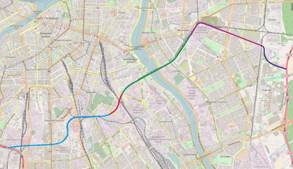 - 4-й этап — участок от улицы Коммуны до КАД в районе Кудрово;