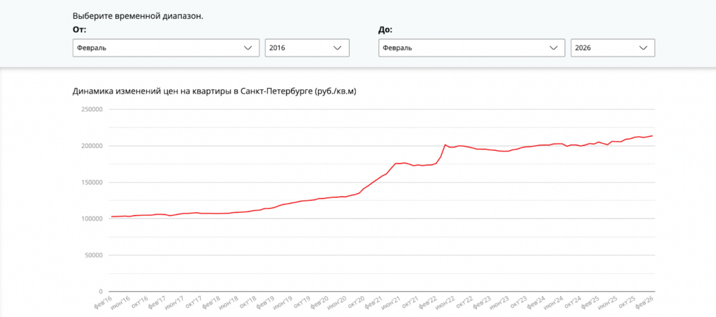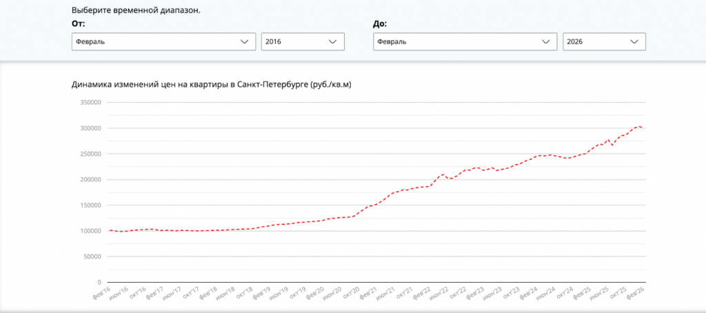 Кому-то эта фраза может показаться бредом сумасшедшего. Но как бы то ни было, это действительно так. На протяжении последних 10 лет все диванные критики пророчат падение цен, обвал, крах и прочие природные и не очень катаклизмы. На вторичном рынке действительно могут быть скачки. Сравните эти два графика. Динамика первичного рынка (данные bn.ru) за период январь 2016 — январь 2026: