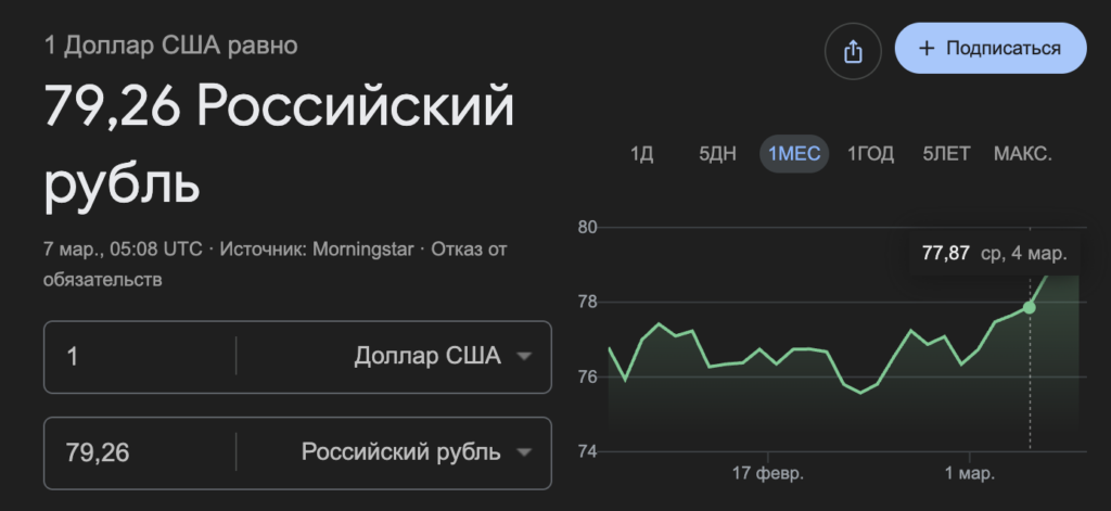 Как было написано выше, застройщики вынуждены идти на повышение из-за роста ставки ПФ. Но помимо этого на цены сильно влияет курс доллара. На день написания статьи картинка такая: