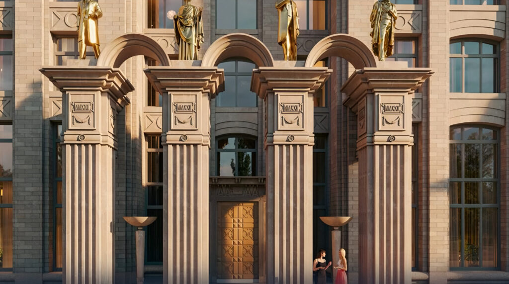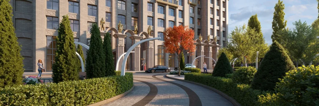 Фасады в стиле «московского ренессанса» с богатым декором; ступенчатая композиция визуально «облегчает» высоту. В лобби — панорамное остекление, дизайнерский свет, зелёные композиции, места для встреч и коворкинг-пространство. Внутренний двор оформлен как приватный сад-парк с прогулочными аллеями.