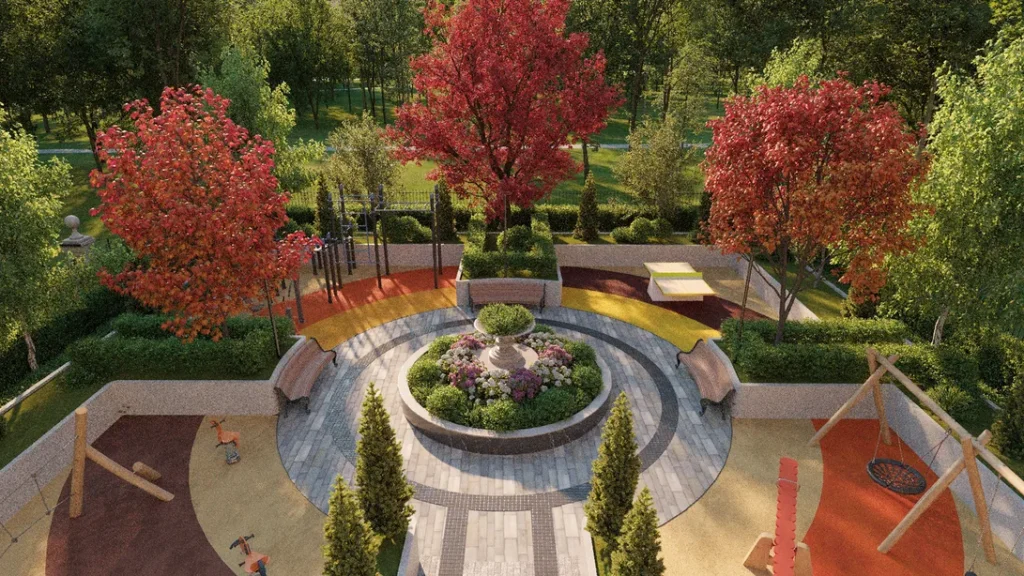 - Детские и спортивные площадки, ФОК и медицинский центр в составе проекта.