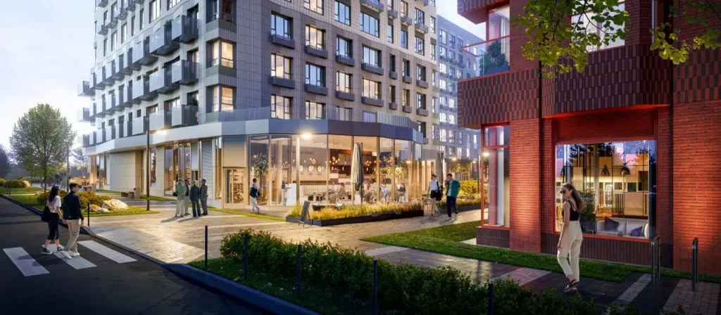 Проект рассчитан на жизнь «всё рядом» — с повседневными сервисами внизу и социальными объектами внутри квартала: