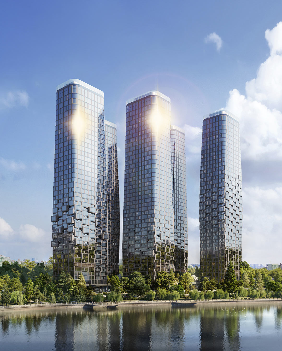 Архитектуру разрабатывали международная и российская команды, а визуальная идея проекта — минимализм, вдохновлённый природными формами. Заявленная доминанта квартала — стеклянная башня с образом «водопада», которая будет считываться издалека.