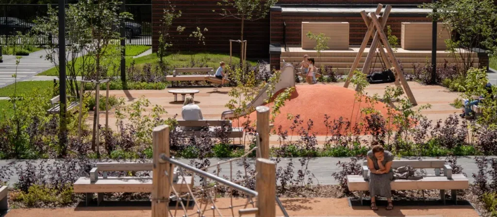 - столы и лавочки со встроенными зарядками (удобно для работы на воздухе).