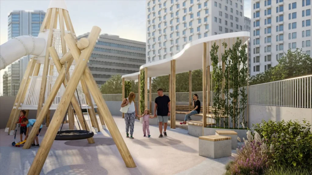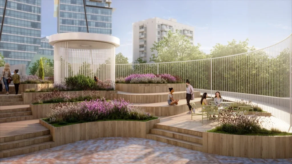 - Панорамный двор-терраса на высоте 7 м: зоны тихого отдыха, уличный коворкинг, воркаут, уличное освещение.