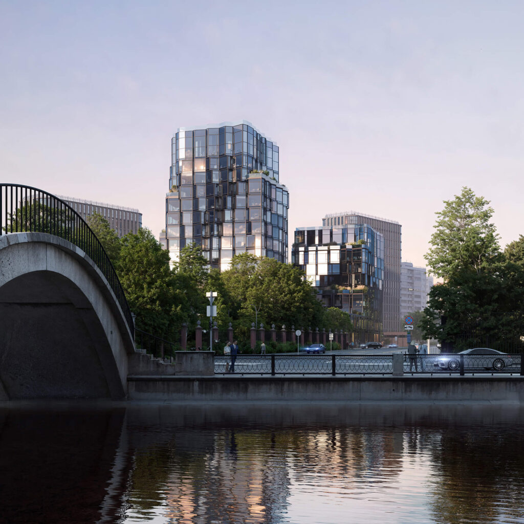 Визуальная концепция выполнена в стиле emo-tech: сложная пластика фасадов, сочетание металла и стекла, динамика линий. Панорамные витражи от пола до потолка добавляют света и открывают виды на воду, набережные и центр Москвы.
