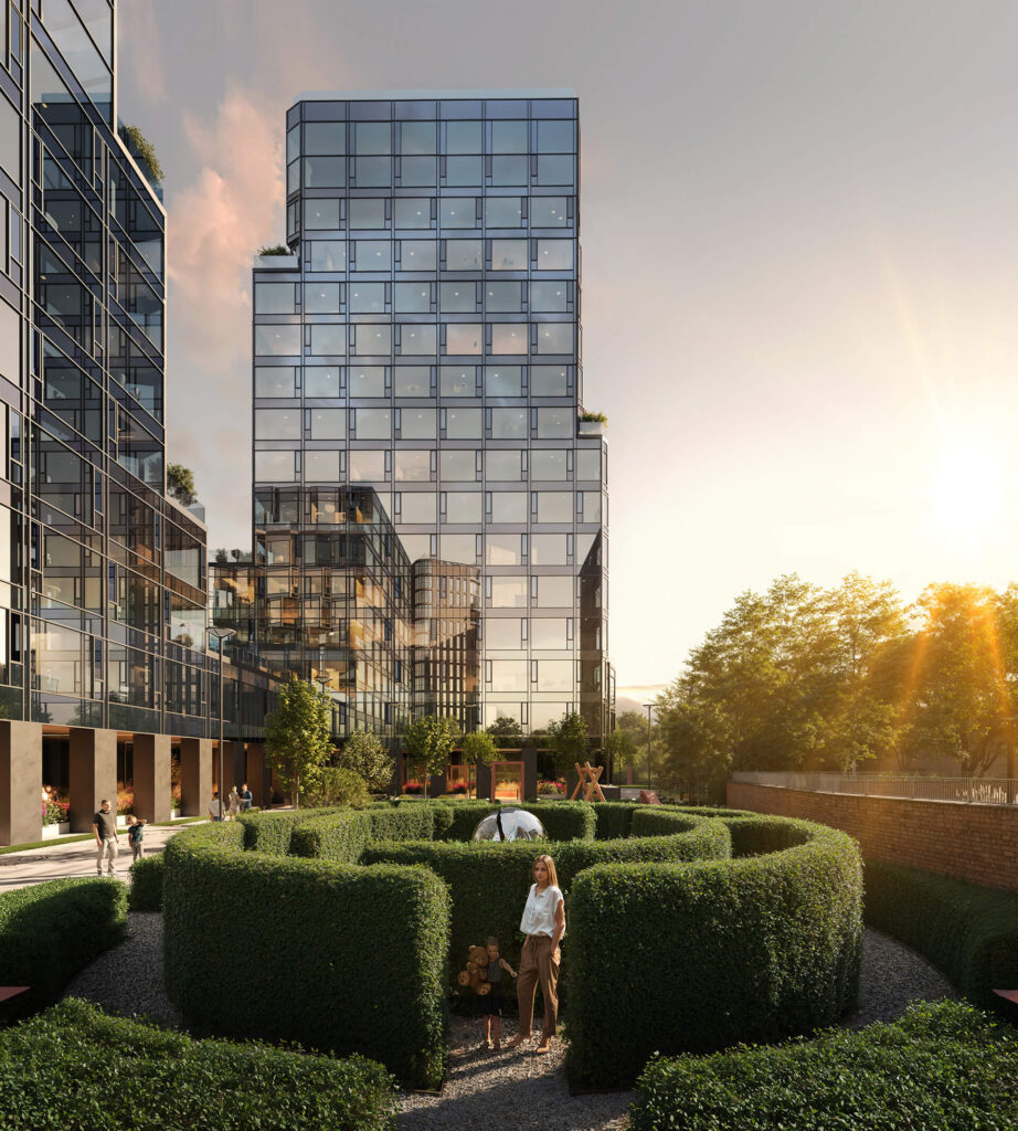 Придомовая территория закрыта и благоустроена: зеленый «лабиринт», променад, приватные зоны отдыха и детская площадка. В проекте предусмотрены безбарьерные входы и продуманные решения для зимнего периода.