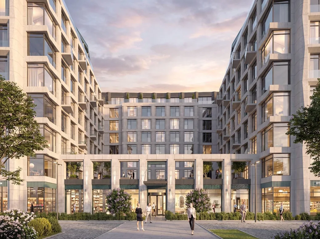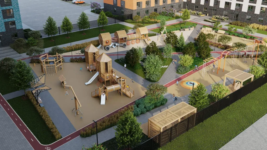 Внутреннее пространство комплекса спроектировано как зелёный двор-парк: