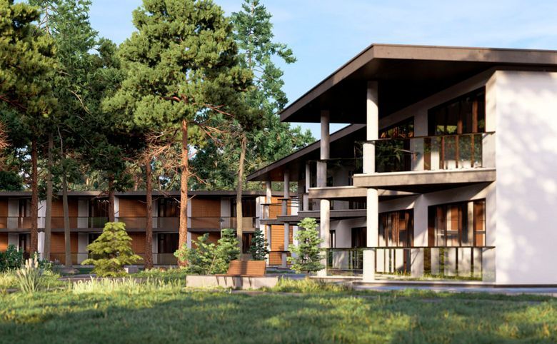 ЖК «Сосновый бор» — это современный малоэтажный жилой комплекс, органично вписанный в природный ландшафт. Архитектура выполнена в сдержанном современном стиле с акцентом на натуральные материалы и панорамное остекление.