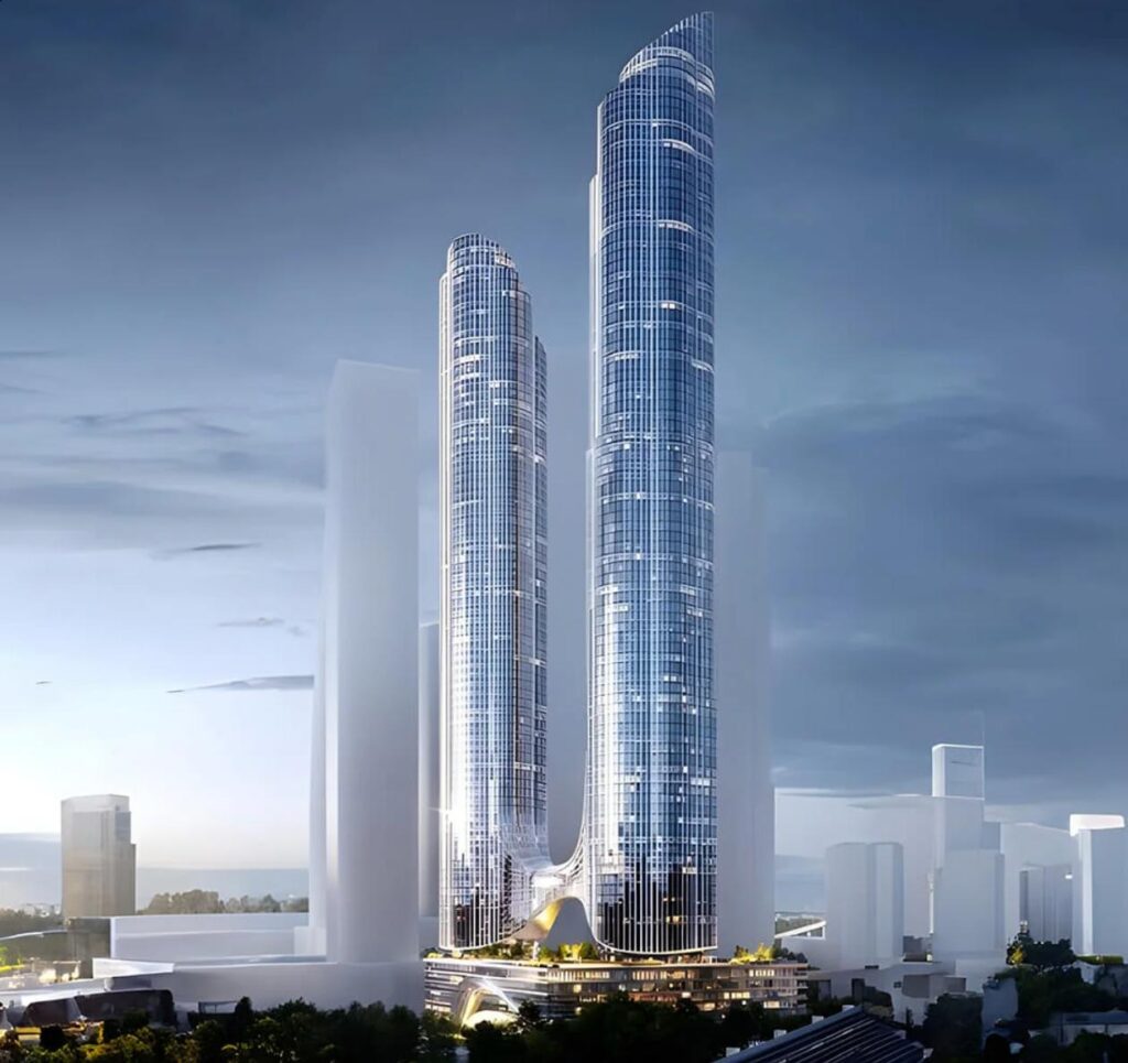Проект объединяет две высотные башни (83 и 97 этажей), соединённые шестиярусным стилобатом с офисами, торговыми галереями и сервисными функциями. Общая площадь застройки по данным ГПЗУ — около 280 800 м², из которых около 231 800 м² составит жильё.