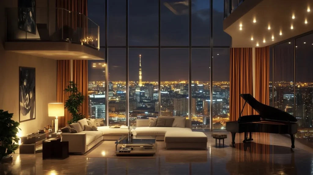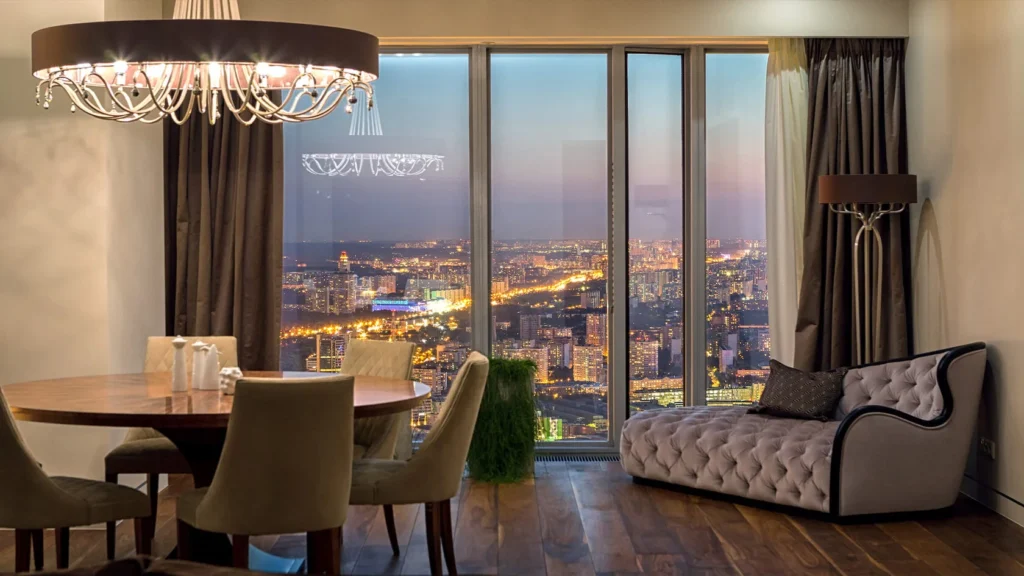 - Архитектура сочетает высокотехнологичное стекло и металлические фасады, с динамической вечерней подсветкой и панорамным остеклением.