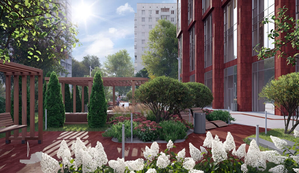 - двор без машин с ландшафтным дизайном;