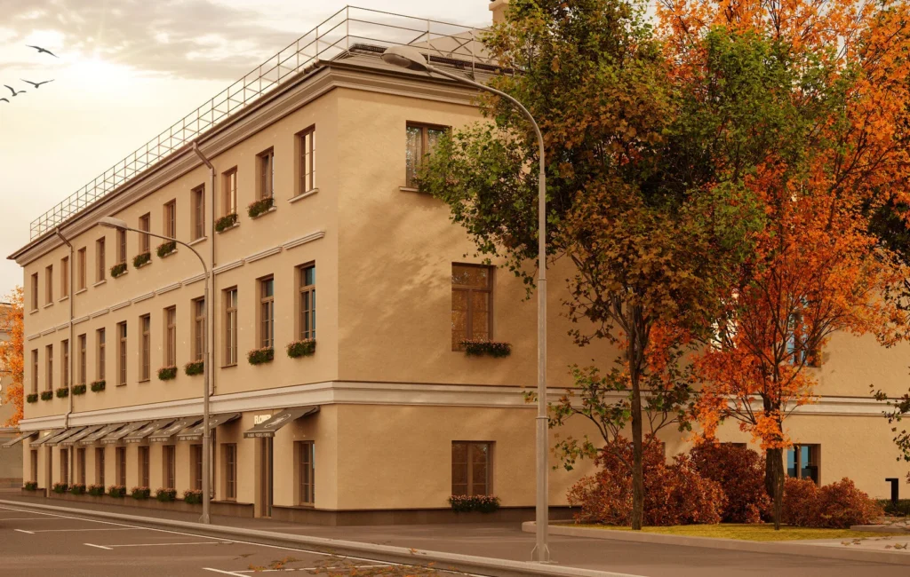 Апарт-отель представляет собой 3-этажный корпус с мансардным уровнем. Сохранены аутентичные детали фасада, входные группы оформлены в светлых тонах износостойкими материалами.