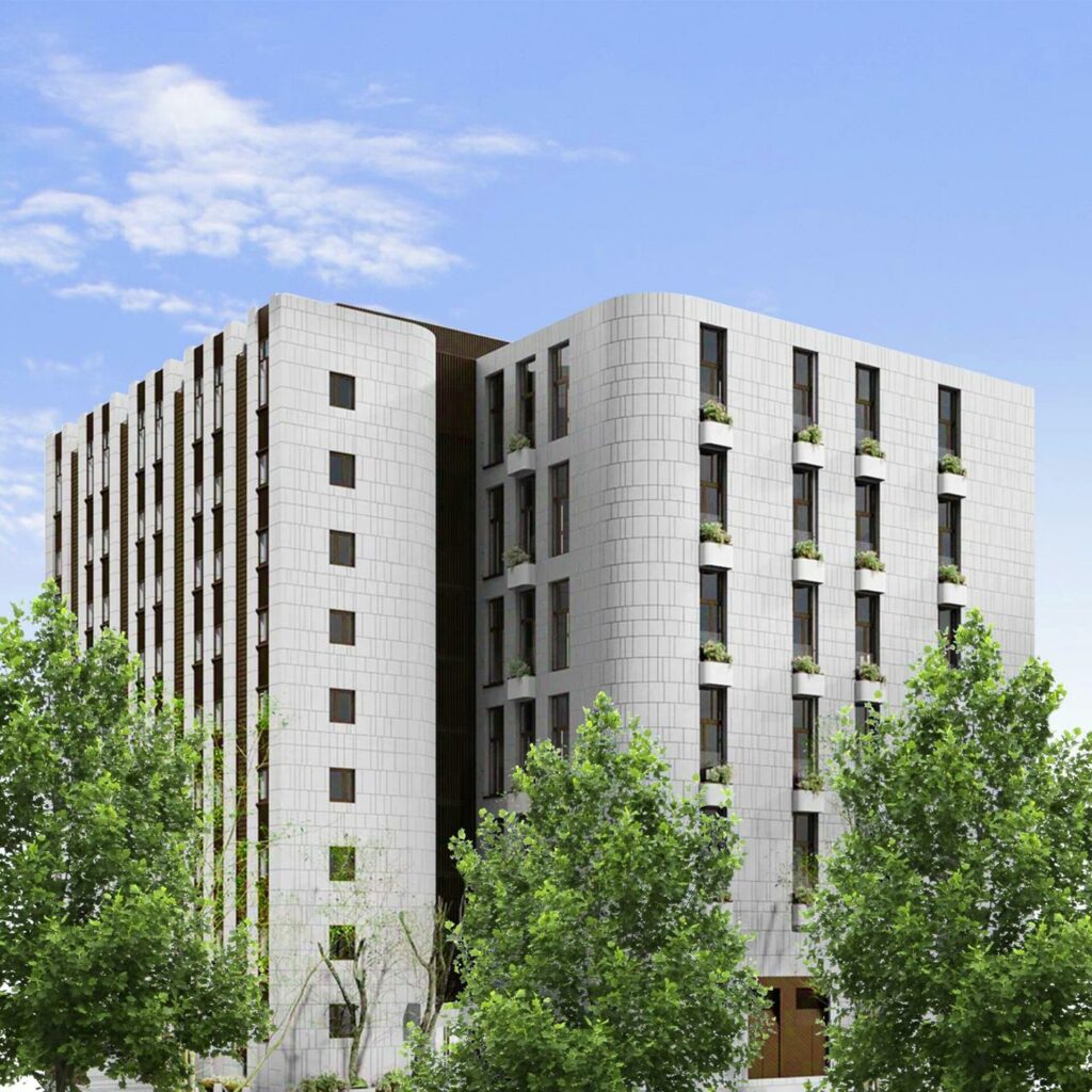Serebro by Avenue-Apart — камерный многофункциональный комплекс на Серебристом бульваре, объединивший городскую динамику и спокойное жилое окружение. Здание переменной этажности (6–9 этажей) выполнено по кирпично-монолитной технологии с современным фасадом в серо-белой гамме.