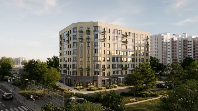 Общественные зоны оформлены в едином архитектурном ключе — пешеходные дорожки, освещение, ландшафтное озеленение и уютные зоны отдыха.