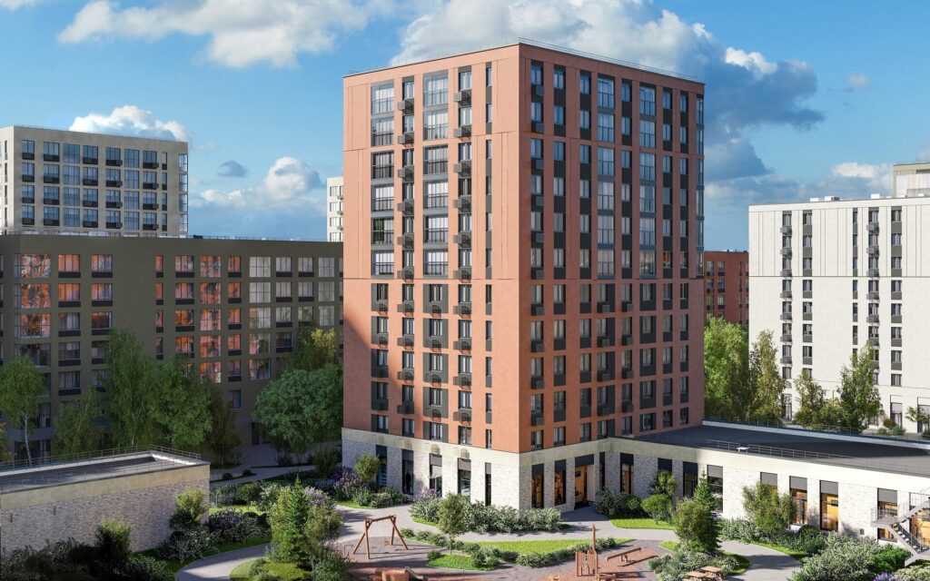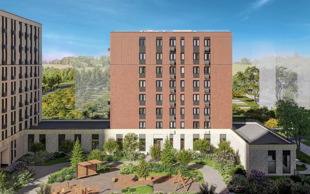 Проект выполнен в скандинавском стиле: спокойная палитра фасадов, природные оттенки штукатурки, клинкер на нижних этажах, широкие окна до 2,5 м. Разноэтажность корпусов (7–12 этажей) делает квартал визуально динамичным и уютным.