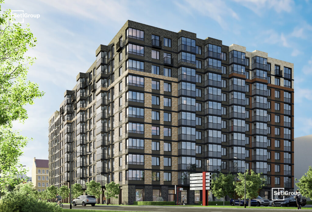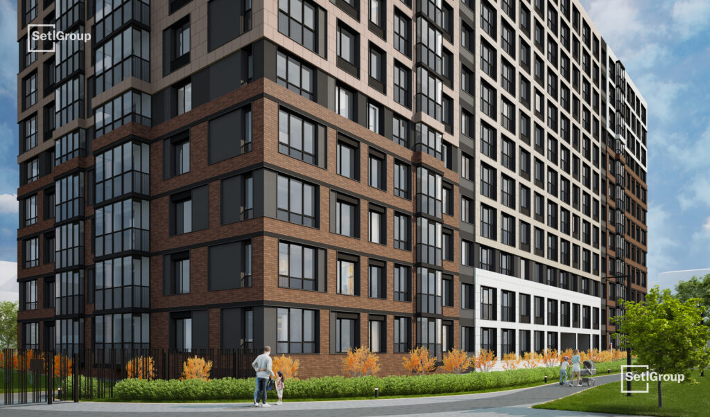 Стиль — современная классика: керамогранит тёплой палитры и кирпич природных оттенков, витражи на балконах, спокойная геометрия фасадов. Доминируют 12-этажные корпуса с чётким ритмом и аккуратной подсветкой.