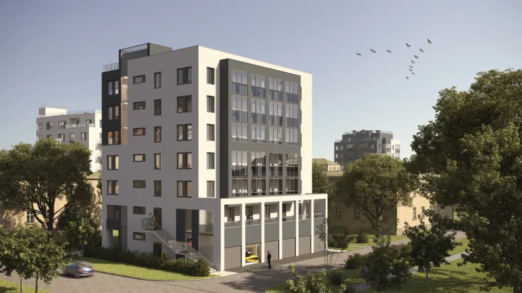 - Крытый паркинг на 1-м этаже каждого корпуса (10–12 мест с двухъярусной системой хранения).