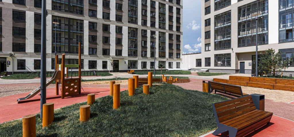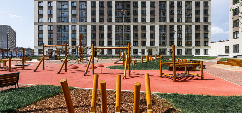 - Есть спортивные площадки, зона уличных тренажёров, площадка для йоги, столы для настольного тенниса.