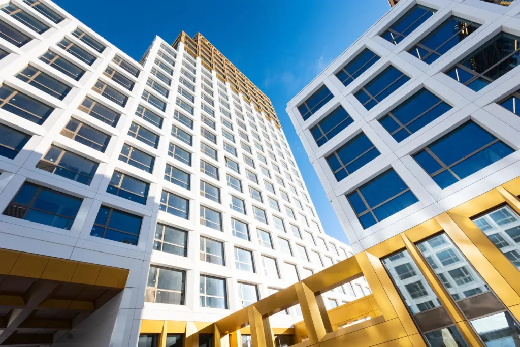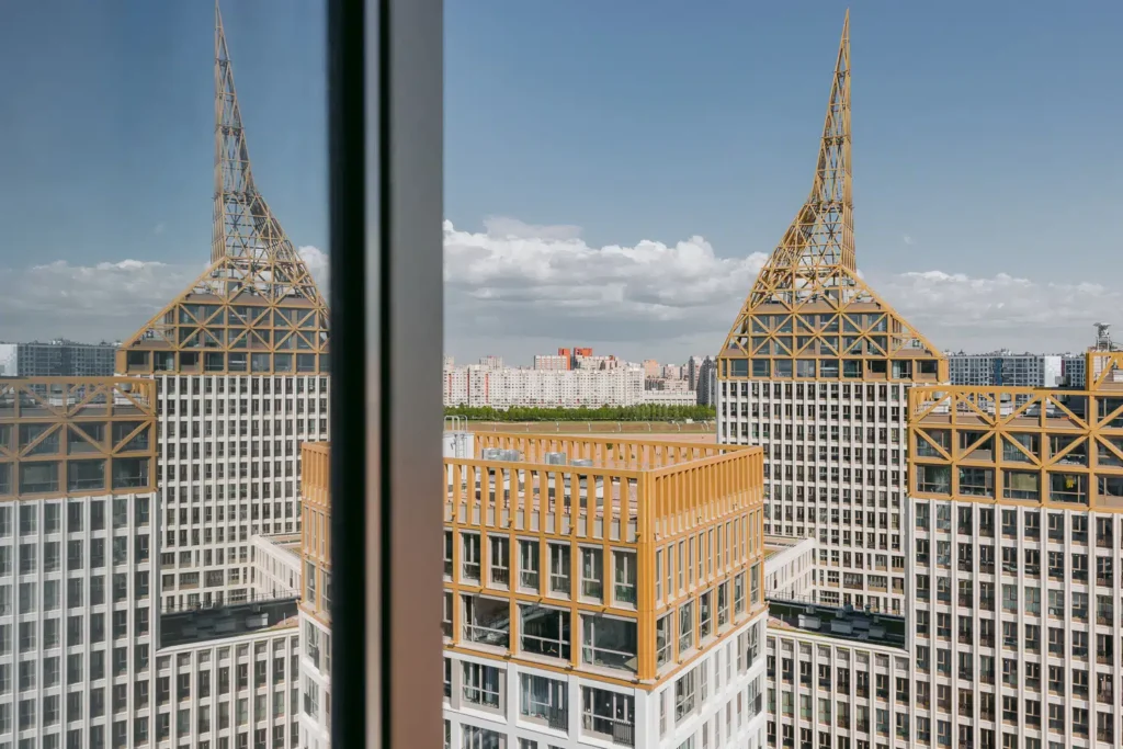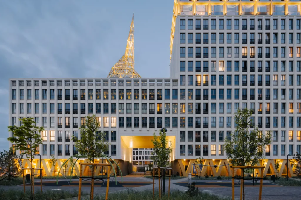 Главная особенность — золотые шпили и белоснежные фасады, напоминающие об исторической архитектуре центра города.