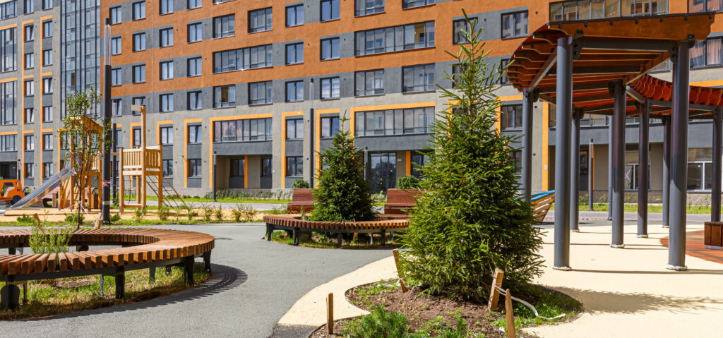 - дворы без машин — транспорт выносится за периметр и в паркинги;