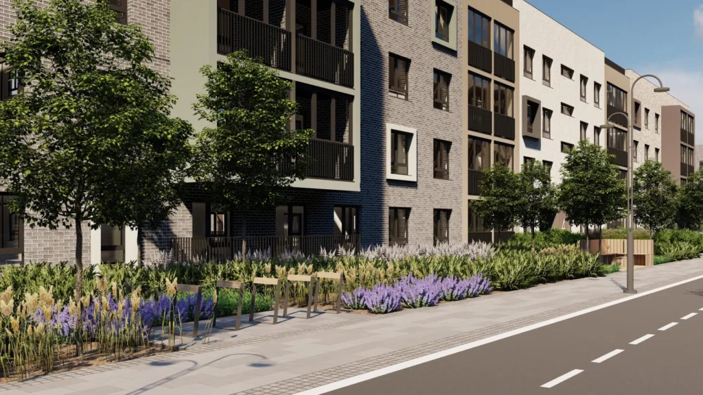 - Предусмотрены зарядные станции для электрокаров и развитые общественные пространства.