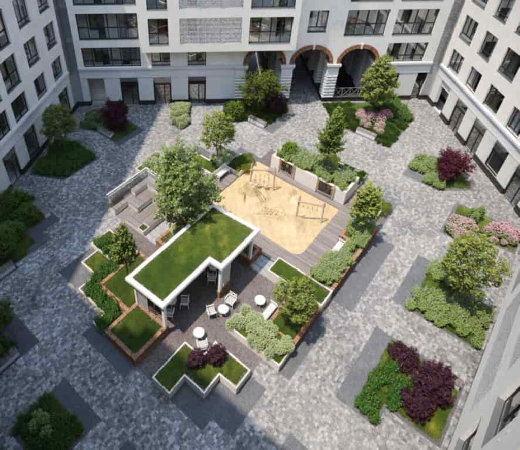 Закрытый двор — ключевой элемент концепции ЖК «Миръ». Он создан как зелёный оазис в центре города: