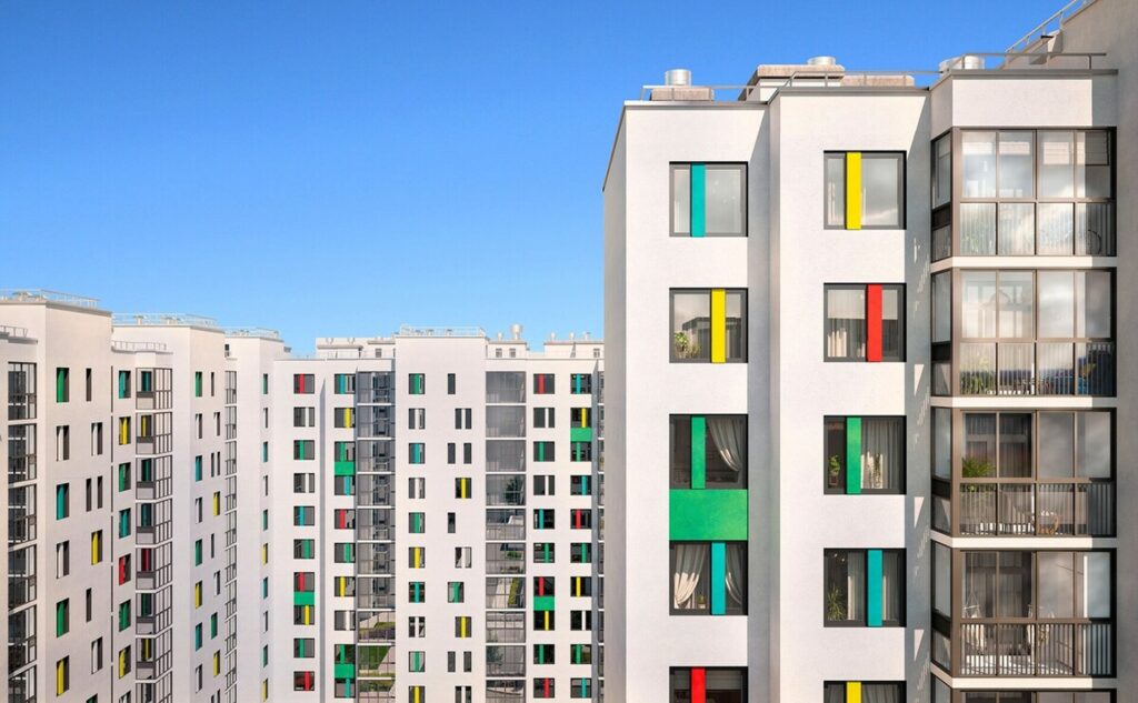 ЖК «Монография» — лаконичный монолитный дом с современными светлыми фасадами и яркими акцентами.