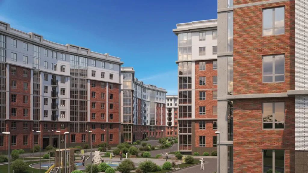 - Двор без машин, оборудованный детскими площадками, спортивными зонами и местами отдыха.