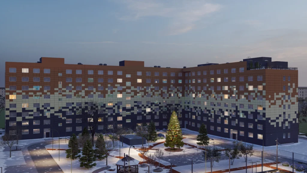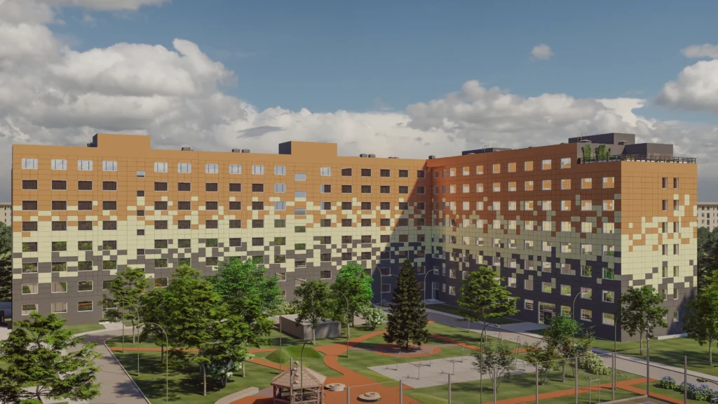 Дома построены по панельной технологии, фасады выполнены в современном стиле с использованием плитки разных цветов, что подчеркивает идею «пиксельного» дизайна.