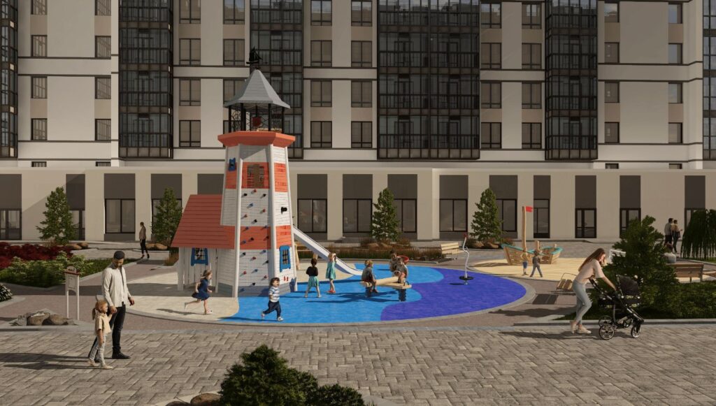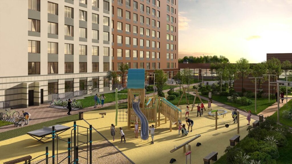 - дворы без машин, яркие игровые зоны и спортивная инфраструктура;