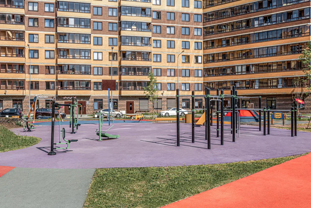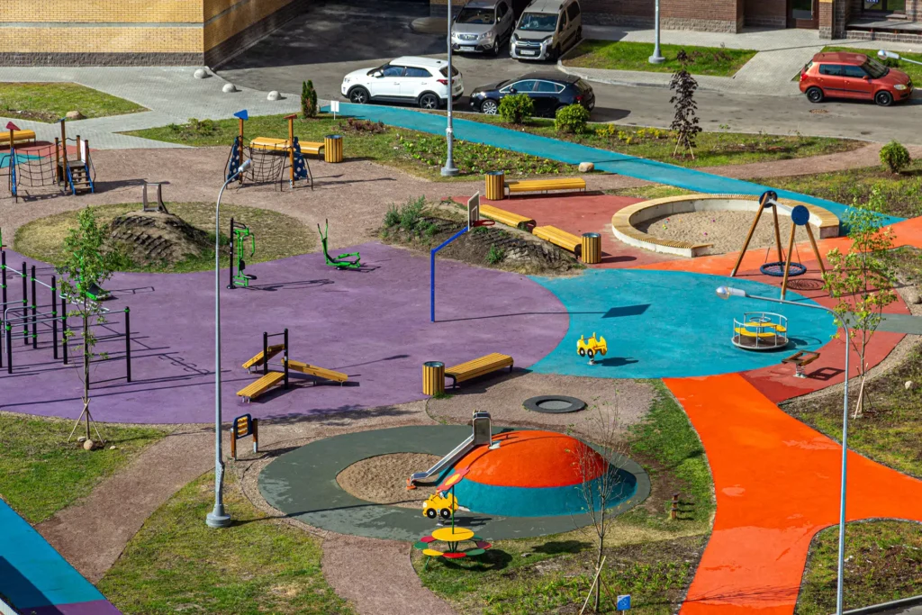 - Детские площадки для разных возрастов с современным безопасным покрытием.