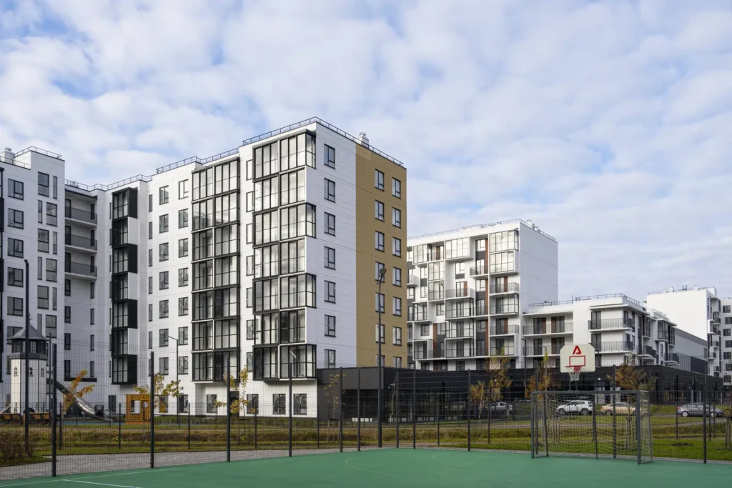 Все корпуса строятся в едином архитектурном стиле — аккуратные фасады из светлой штукатурки создают ощущение пространства и света.