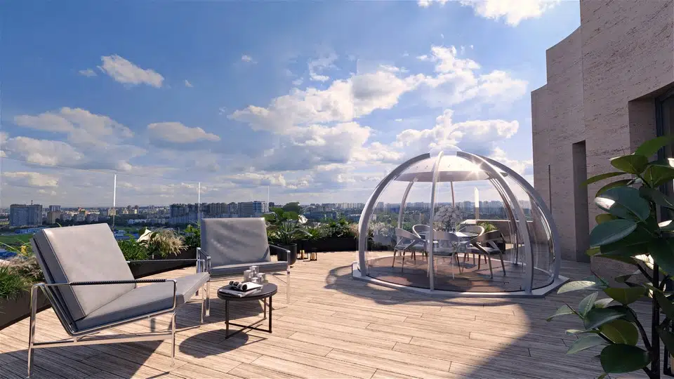 На 24-м этаже оборудована просторная терраса с мягкой мебелью, шезлонгами и панорамными видами всего Санкт-Петербурга.