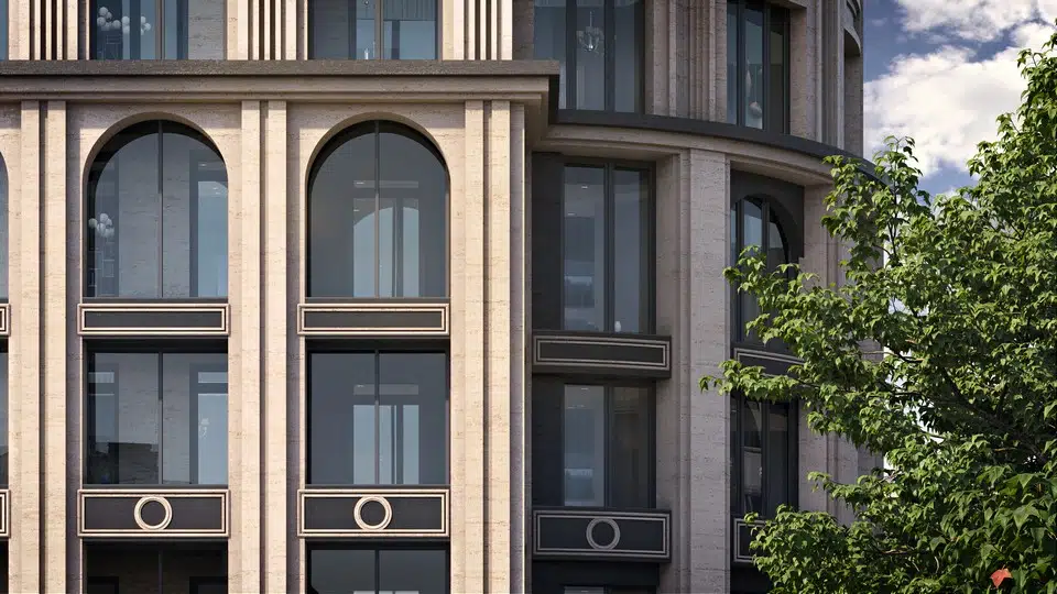 Здание высотой в 24 этажа разработано бюро «НИиПИ Спецреставрация». Фасады выполнены с использованием декоративного камня, а венчающий карниз в форме волн подчёркивает премиальный силуэт дома. В вечернее время фасад подсвечивается, создавая эффектную атмосферу.