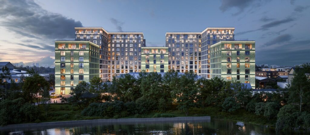 «Шкиперский 19» делает ставку на невысокую для локации этажность и спокойную палитру фасадов: природные оттенки, аккуратный ритм и архитектурная подсветка.
