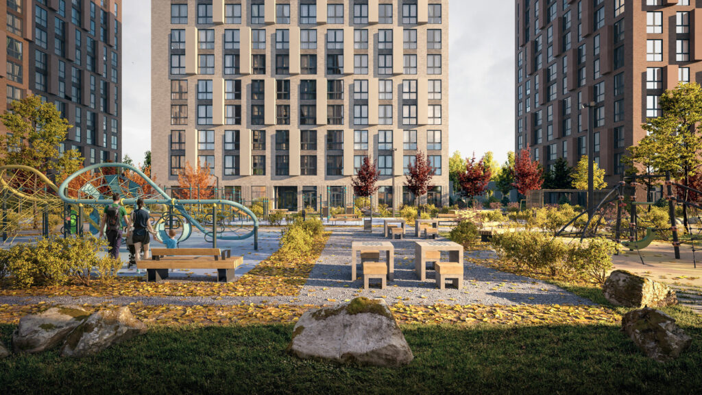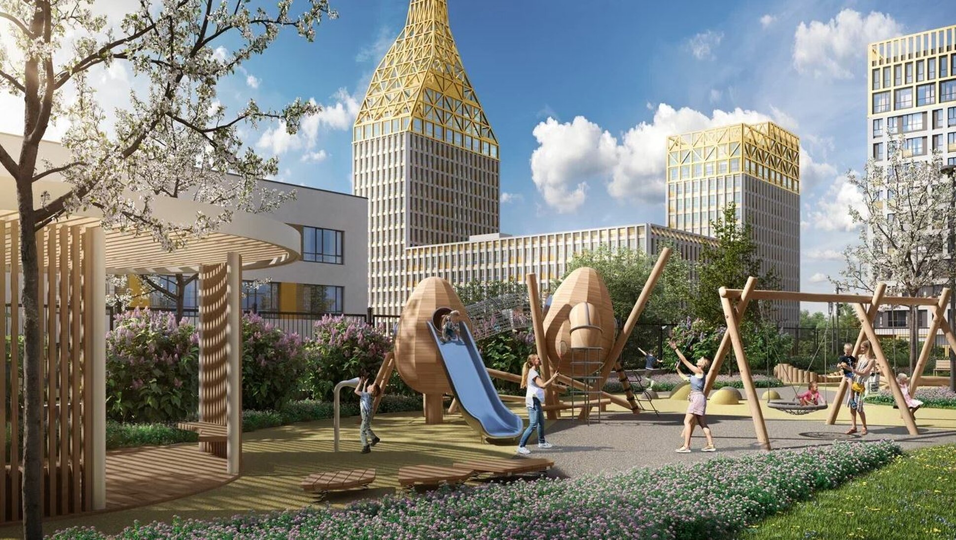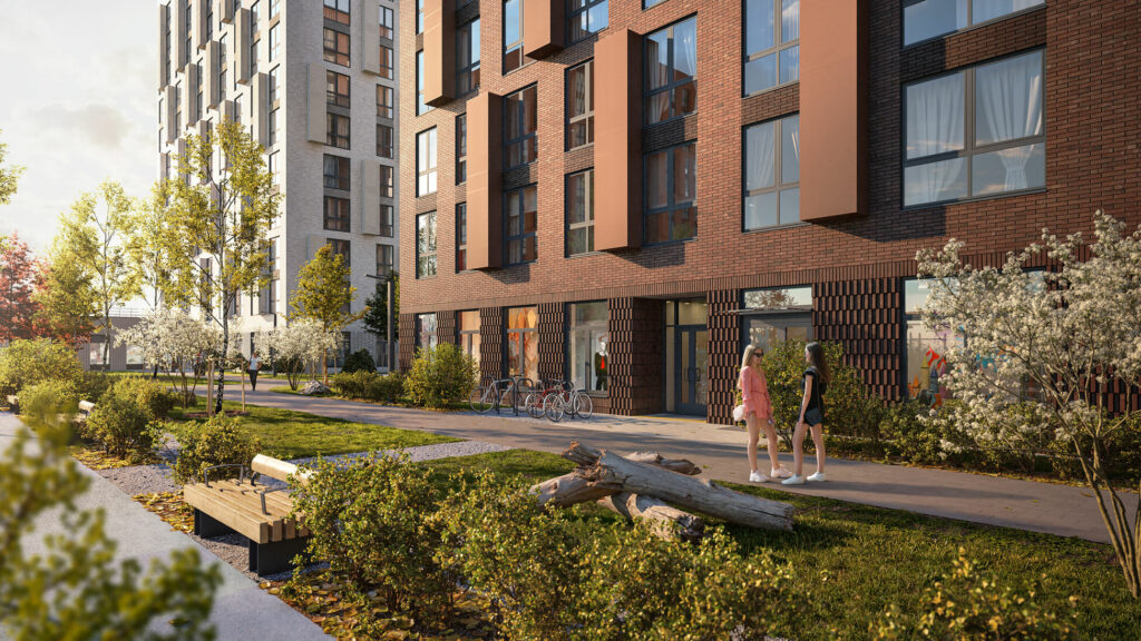 На первых этажах — магазины, кафе и сервисы «на лифте вниз». Для семей важный плюс: в проекте заявлены школа и детский сад (детсад — на 280 мест).