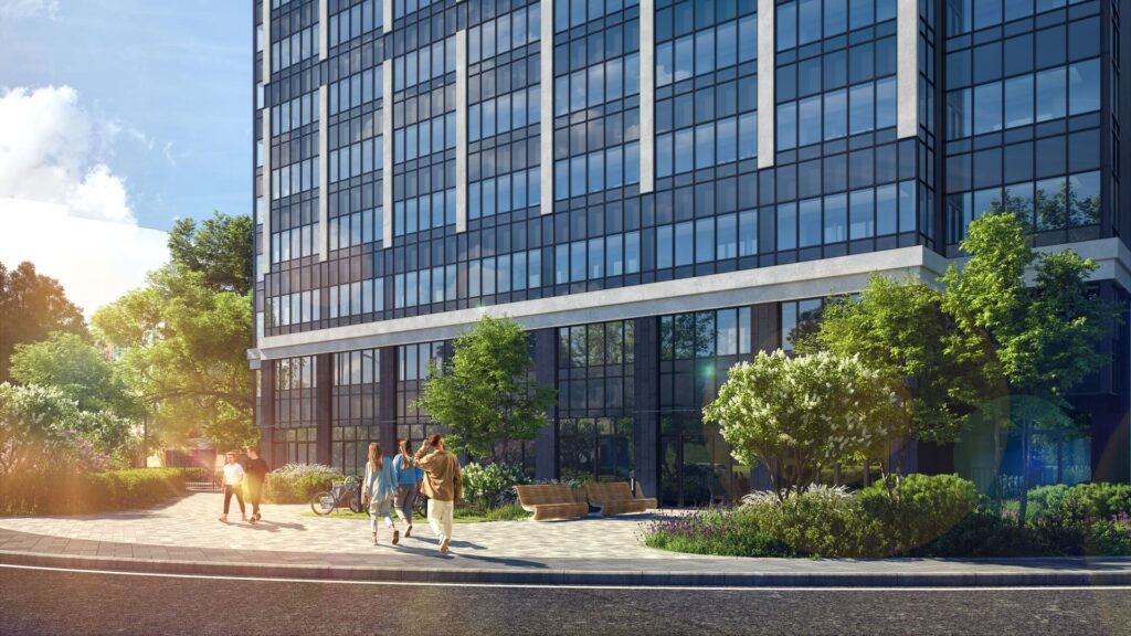 Комплекс выполнен в спокойной скандинавской гамме. Панорамное остекление, керамогранит на нижних этажах и художественная подсветка подчеркивают ритм фасадов. Входные группы сделаны на уровне земли, с витражами и высокими потолками. Вход — с двух сторон, доступ по ключ-карте.