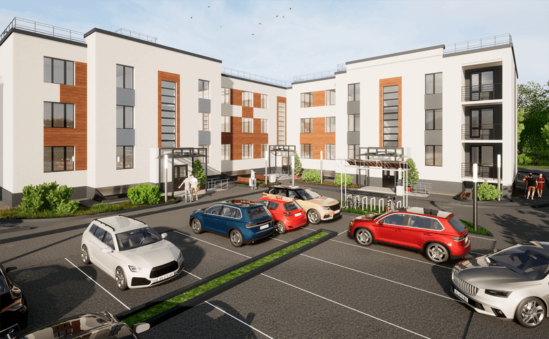 Фасады оформлены с использованием декоративной штукатурки и акцентных элементов, а входные группы располагаются на уровне земли, обеспечивая безбарьерность.
